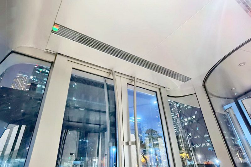項目簡介:中國尊-中信大廈門廳入口原電熱電幕、裝飾吊頂全面升級,康平全定制模塊化電熱空氣幕系統(tǒng),綜合大風(fēng)量、微孔消聲、智能溫度控制、整體建筑裝飾設(shè)計制造,