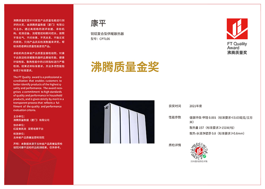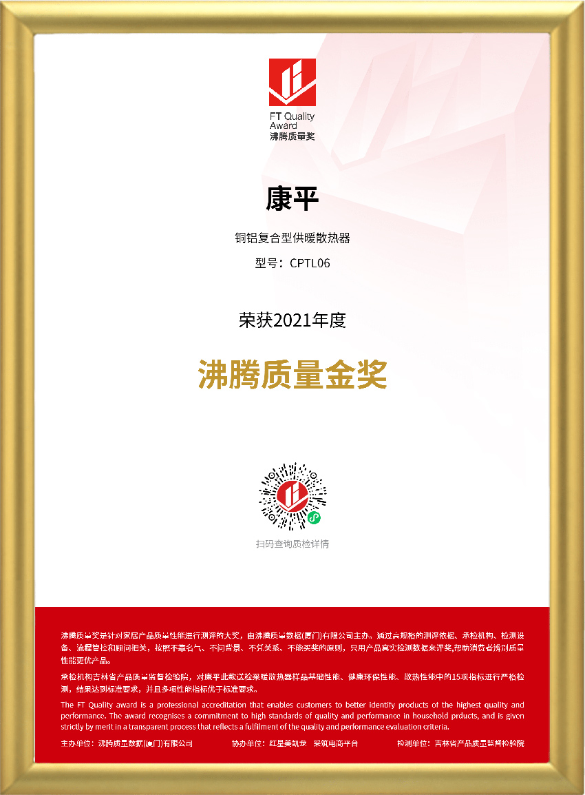 CONPIN康平 銅鋁復(fù)合供暖散熱器CPTL06 斬獲2021年度沸騰質(zhì)量金獎(jiǎng)