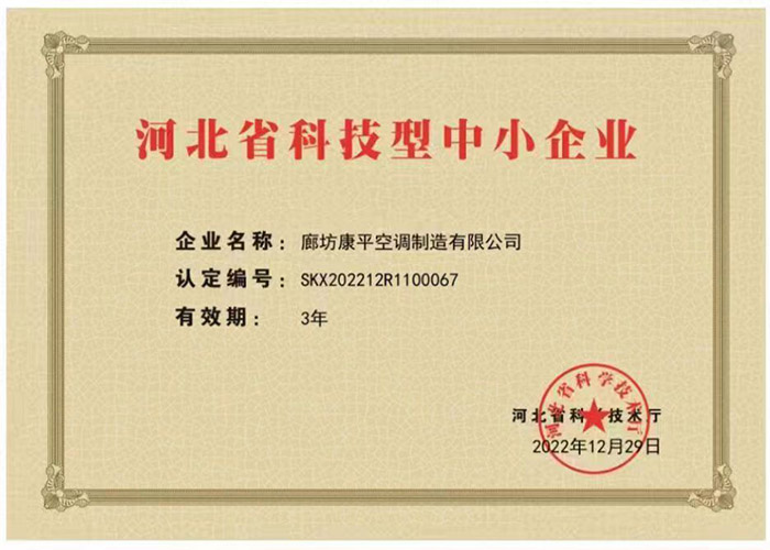 經(jīng)過嚴格執(zhí)行評價標(biāo)準和流程,廊坊康平空調(diào)制造有限公司喜獲河北省科學(xué)技術(shù)廳頒發(fā)的“河北省科技型中小企業(yè)”榮譽認定稱號,之前,康平空調(diào)已獲得“高新技術(shù)企業(yè)”認定。